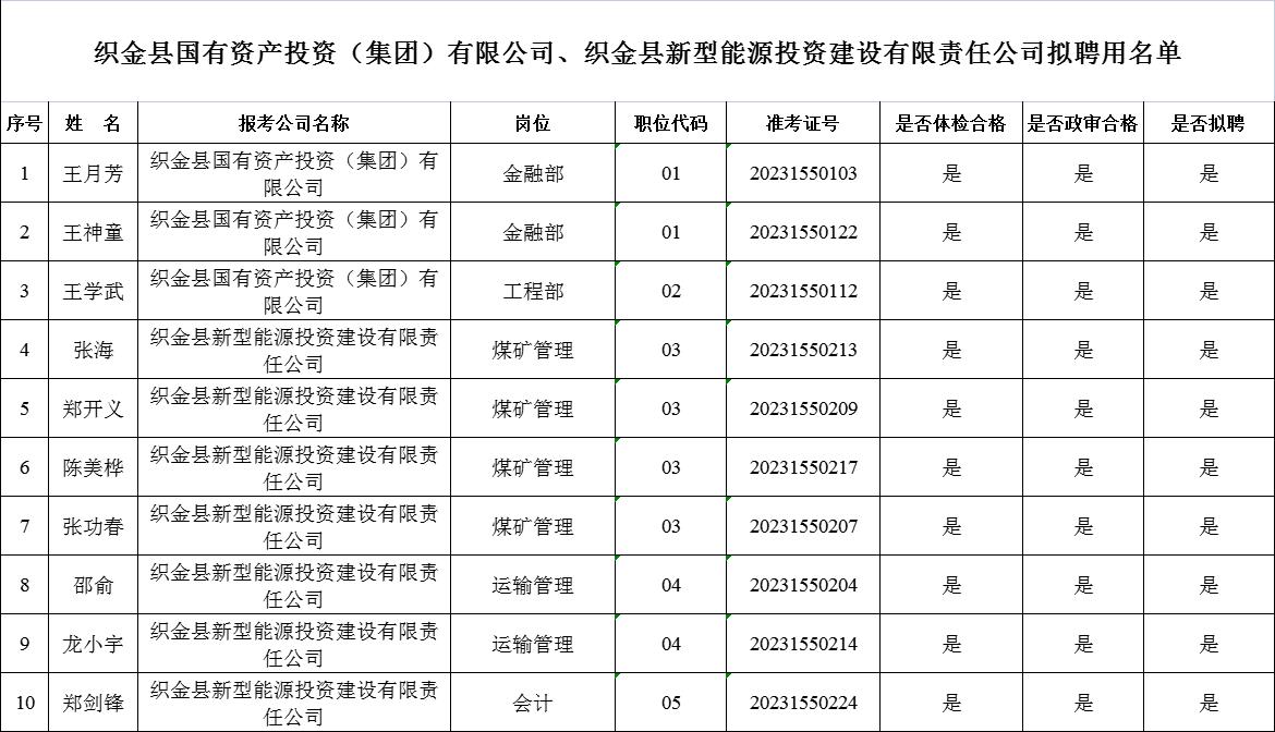 根據(jù)《織金縣國有資產(chǎn)投資(集團(tuán))有限公司、織金縣新型能源投資建設(shè)有限責(zé)任公司2023年面向社會公開招聘工作人員公告》,經(jīng)過報名、筆試、面試、資格審查、體檢、政審等程序,現(xiàn)對擬聘用人(名單見附件1)予以公示。